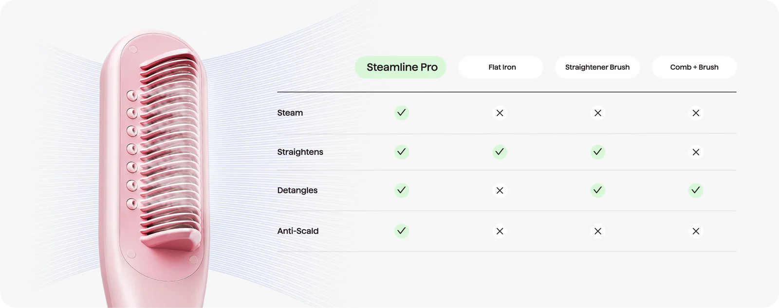 It’s super easy! Start at the roots and work section by section. Hold each strand gently taut and glide the Steamline Pro smoothly from root to tip. The ceramic heat and steam hydration work together to leave your hair sleek, smooth, and shiny—in just minutes.